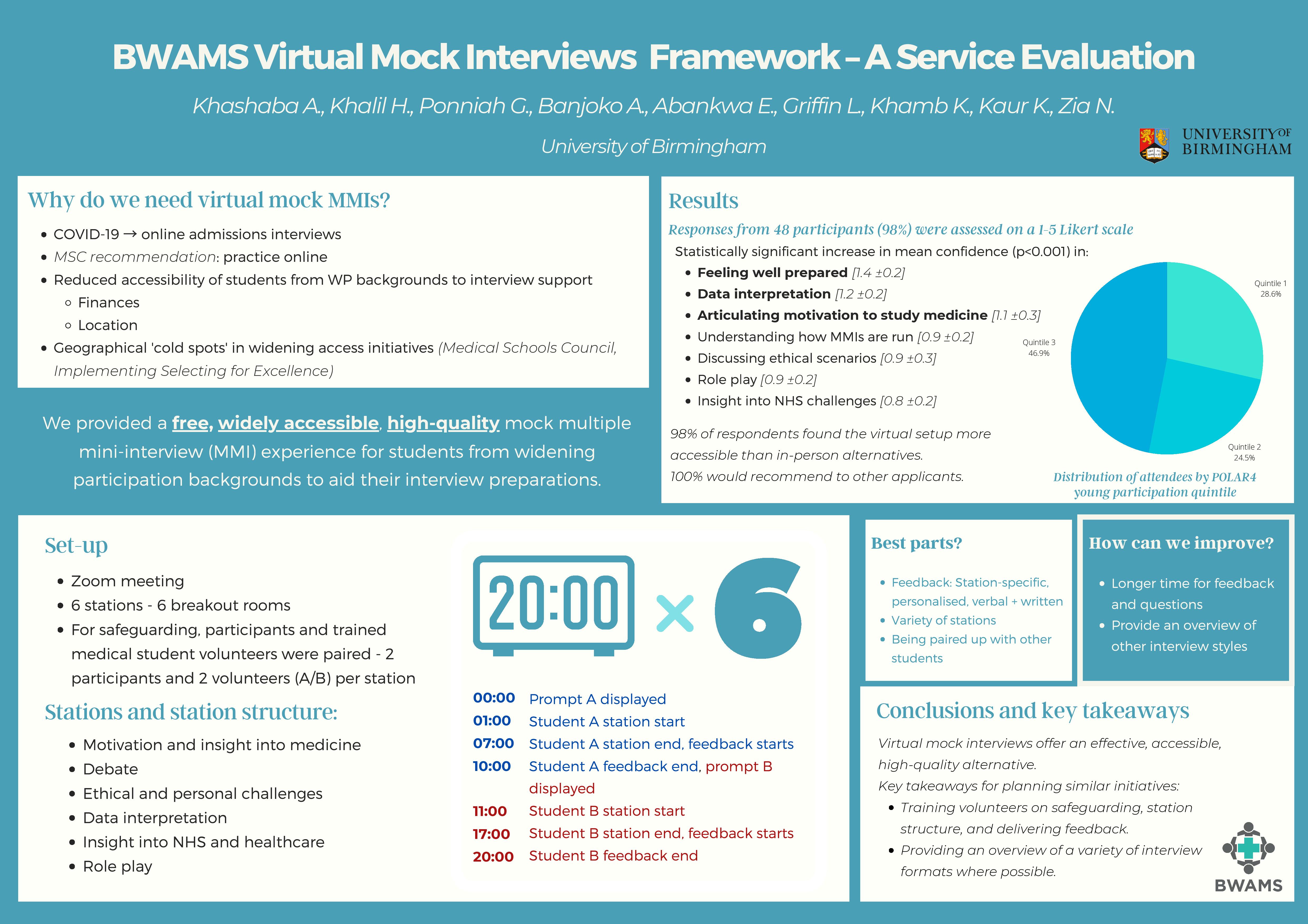 | BWAMS Virtual Mock Interviews Framework–A Service Evaluation | Khashaba A., Khalil H., Ponniah G., Banjoko A., AbankwaE., GriffinL., Khamb K., Kaur K.,Zia N. | axk923@student.bham.ac.uk |
