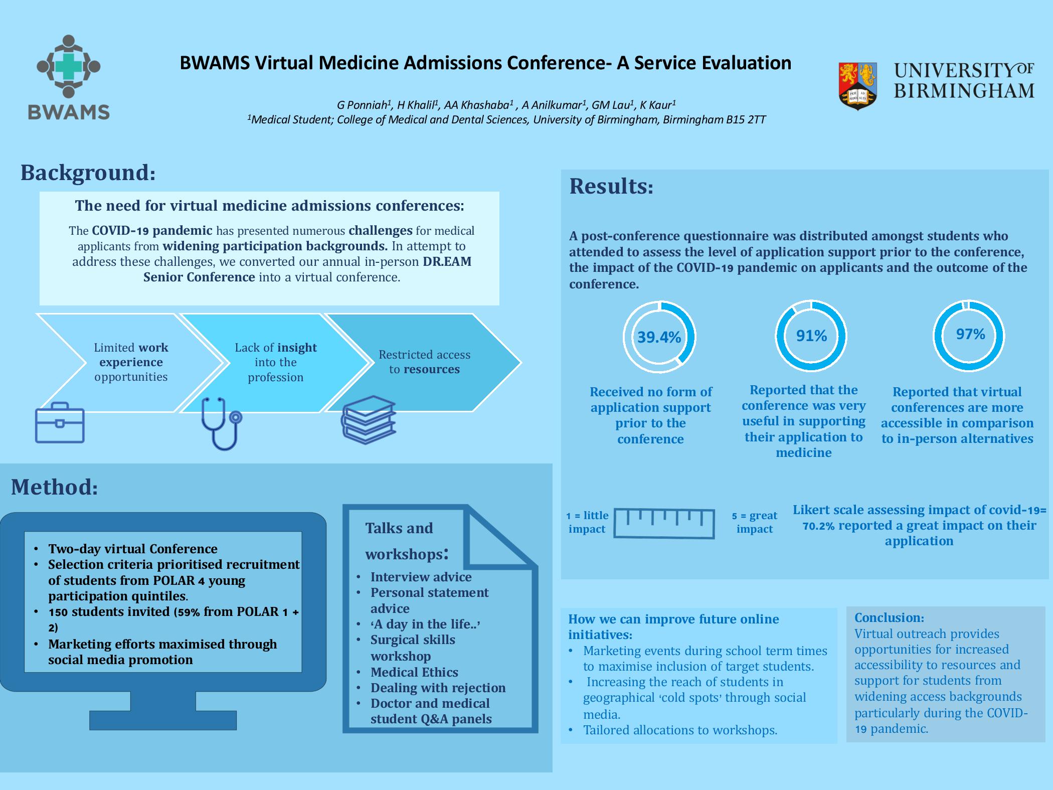 | Dr.eam Virtual Medicine Admissions Conference- A Service Evaluation | Ponniah G., Khalil H., Khashaba A.A, Anilkumar A., Kaur K., Lau GM. | gxp625@student.bham.ac.uk |