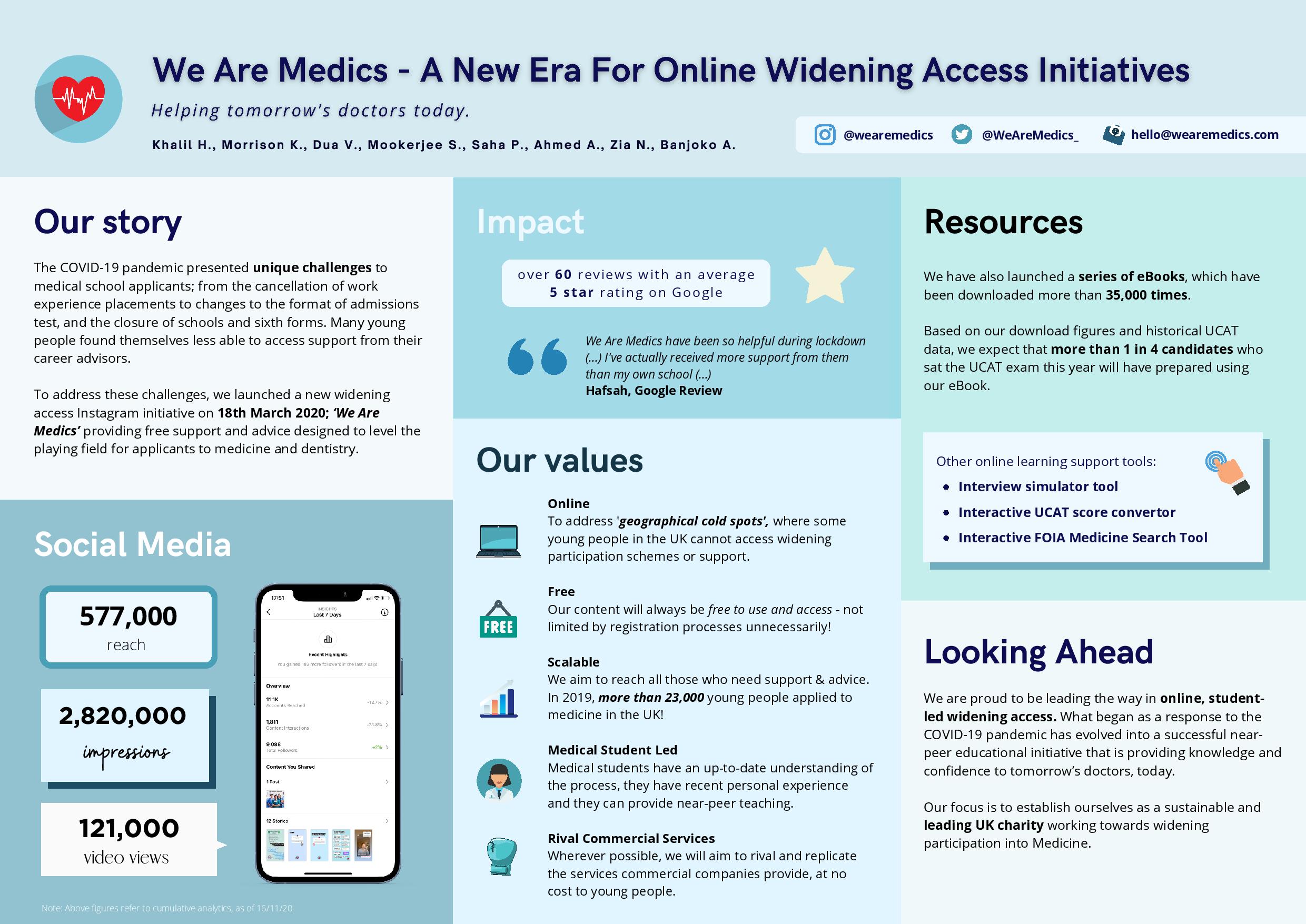 | We Are Medics – A New Era For Online Widening Access Initiatives | Khalil H., Morrison K., Dua V., Mookerjee S., Saha P., Ahmed A., Zia N., Banjoko A. | hello@wearemedics.com |