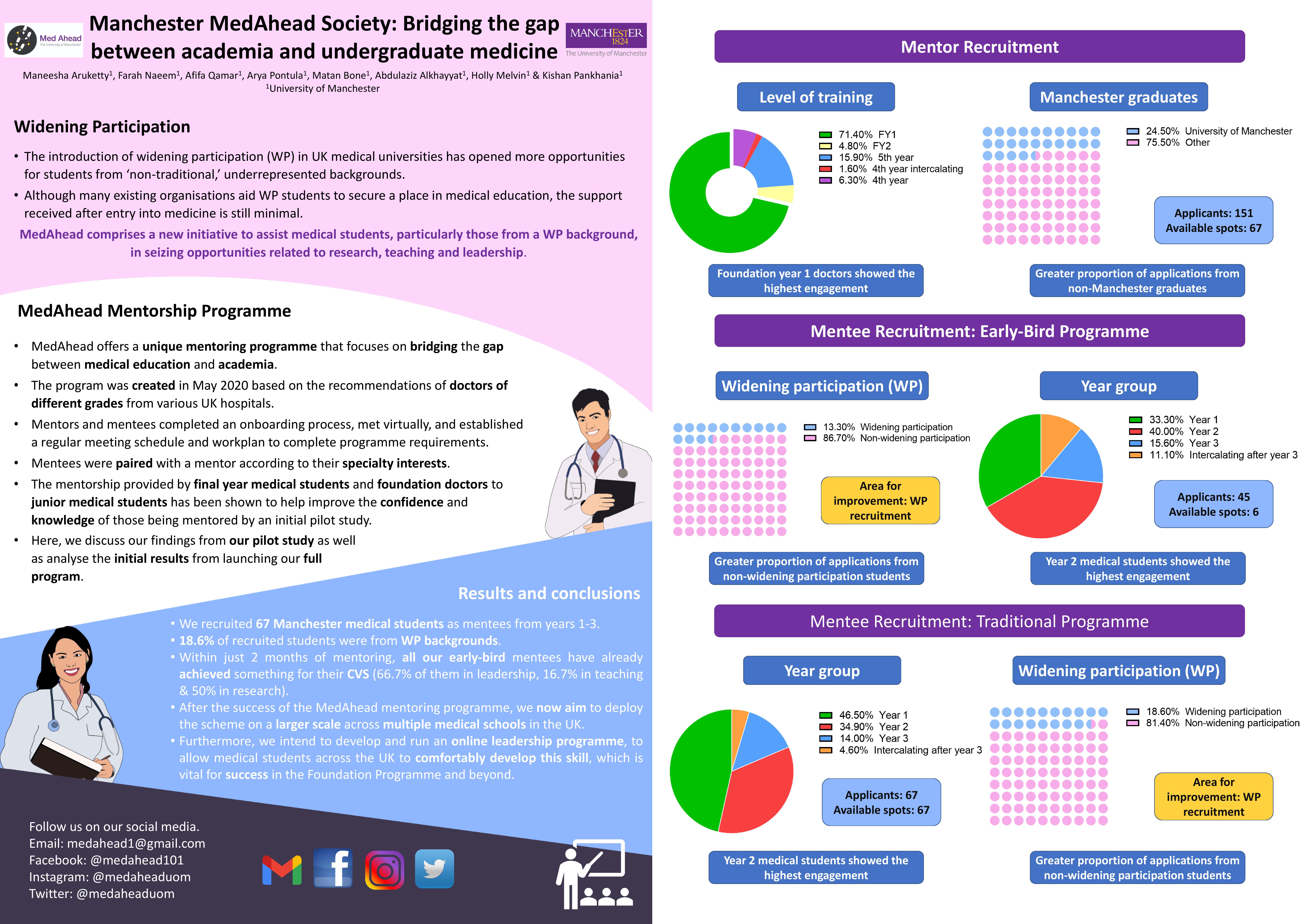 | Manchester MedAhead Society: Bridging the gap between academia and undergraduate medicine | Maneesha Aruketty, Farah Naeem, Afifa Qamar, Arya Pontula, Matan Bone, Abdulaziz Alkhayyat , Holly Melvin & Kishan Pankhania | maneesha.aruketty@student.manchester.ac.uk |