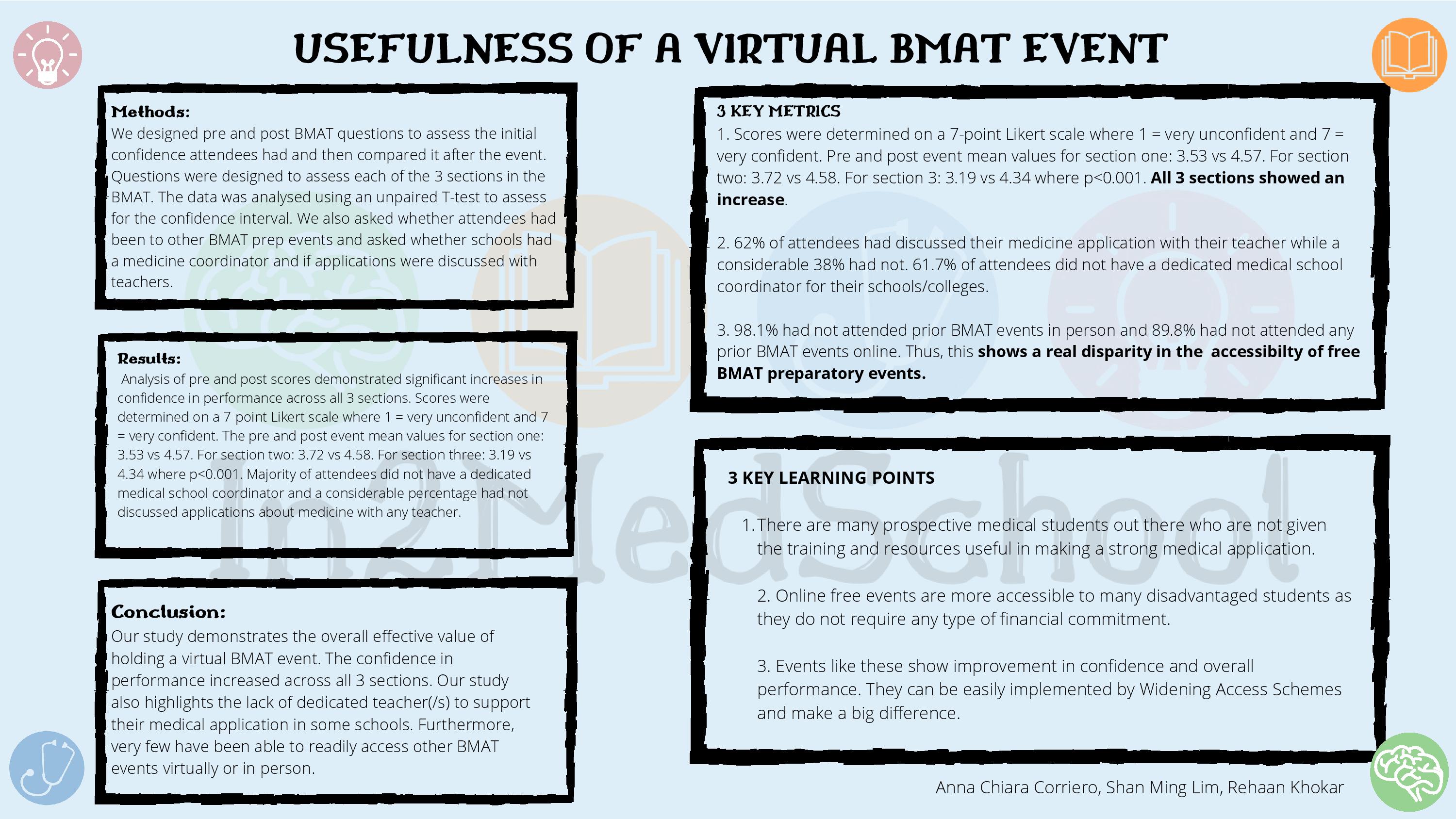 | Usefulness of a Virtual BMAT Event | Anna Chiara Corriero, Shan Ming Lim & Rehaan Khokar | rehaankhokar@gmail.com |