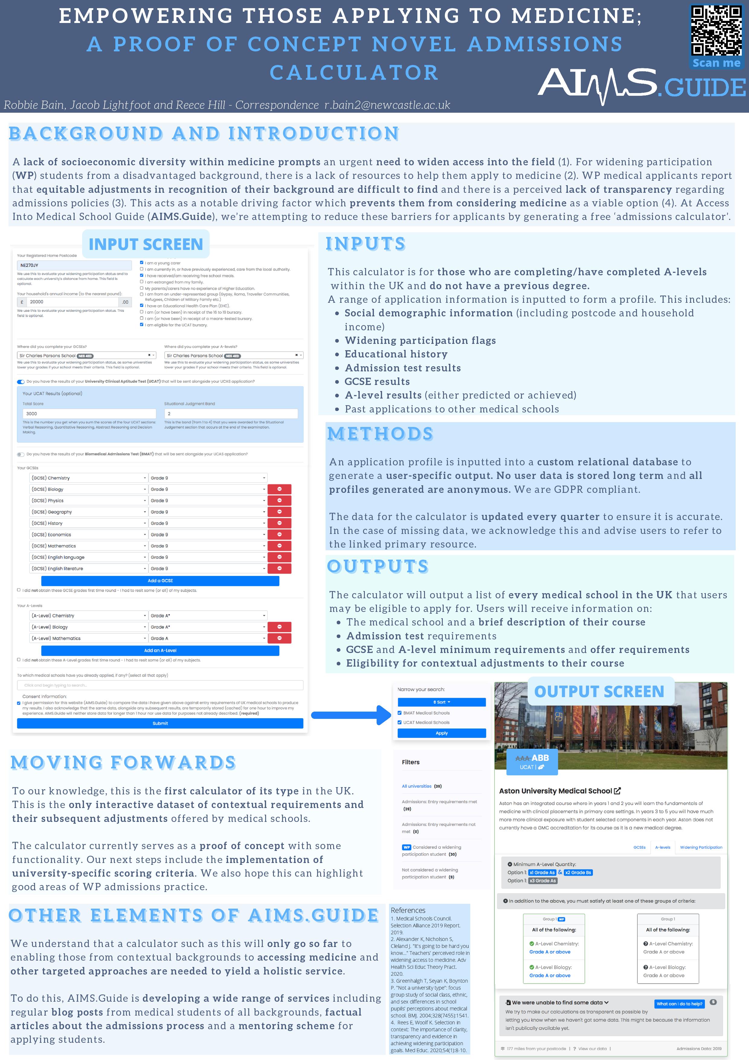 | Empowering those applying to medicine; proof of concept novel admissions calculator | Robbie Bain, Jacob Lightfoot & Reece Hill | r.bain2@newcastle.ac.uk |